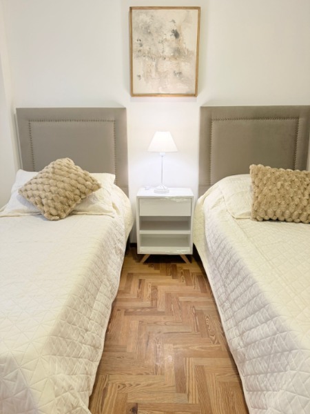 -Habitación con dos Sommier de una plaza, respaldos, mesa de luz y placard. Vista a patio de edificio ( Sin acceso ). cortinas Hunter Douglas