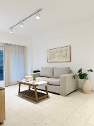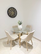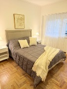 -Al ingresar y a la derecha amplio, luminoso y cómodo living comedor con balcón saliente a la calle. TV de 43”. Sillón, mesa ratona, mueble para TV, mesa con 4 sillas, lámpara de pie, cortinas Hunter Douglas