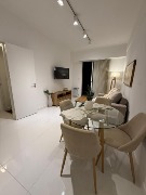 Al ingresar mediante hall de distribución, accedemos al amplio y cómodo living comedor con balcón salida a patio. TV de 43”. Sillón, mesa ratona, mueble para TV, mesa con 4 sillas, lámpara de pie, mueble de apoyo, cortinas Hunter Douglas. En el patio muebles de exterior